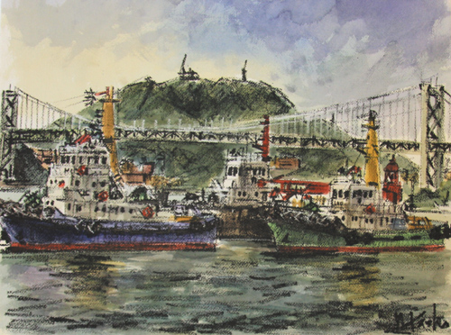 関門橋とタグボート
